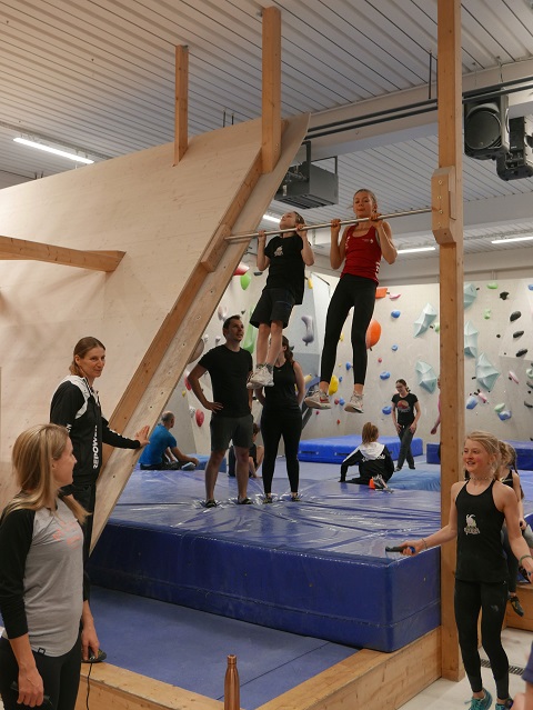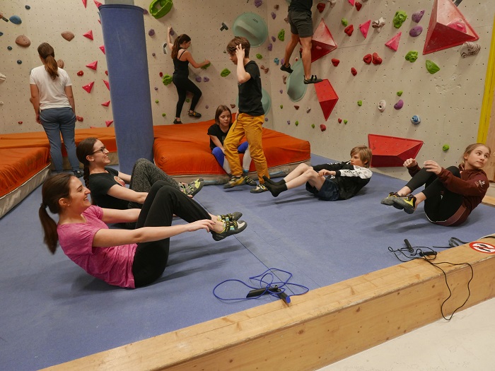 Aufgewärmt wurde mit Seilspringen, Klimmzügen, Liegestütz, Rudern und Boulderquergängen. Alles unter Instruktion, Kontrolle und Korrektur unserer U12 und U14er Athleten. Mit ein bisschen Hilfe gelang dann auch (fast?) jedem ein Klimmzug.