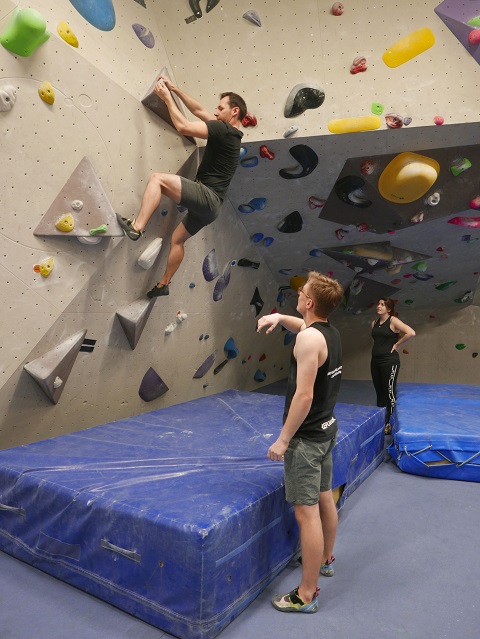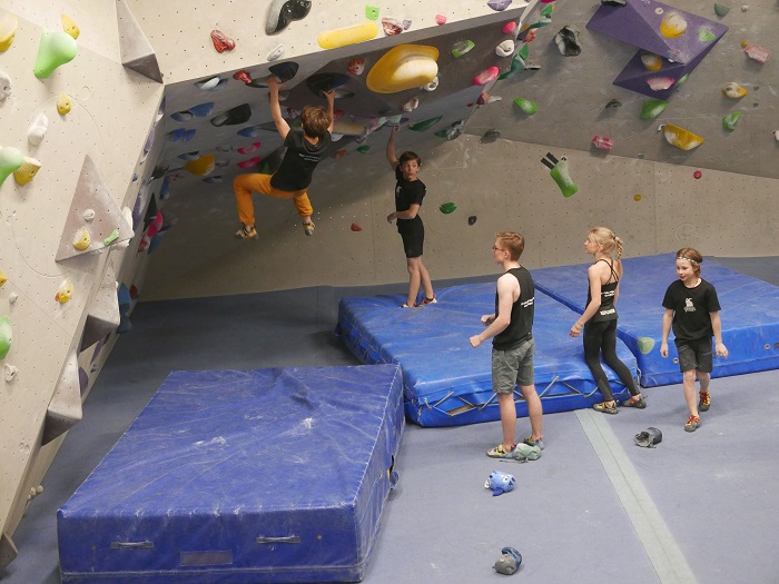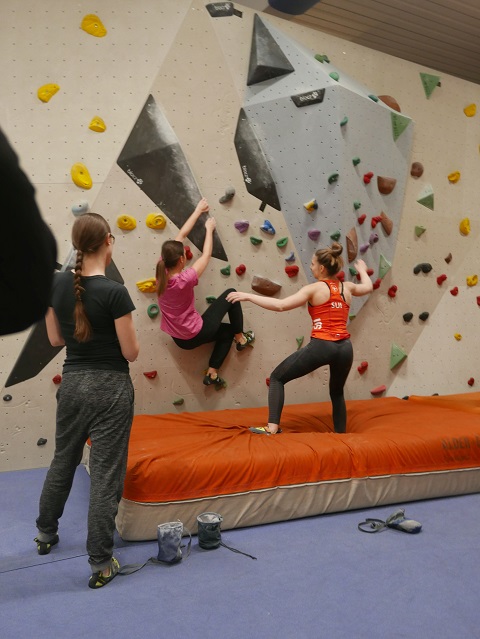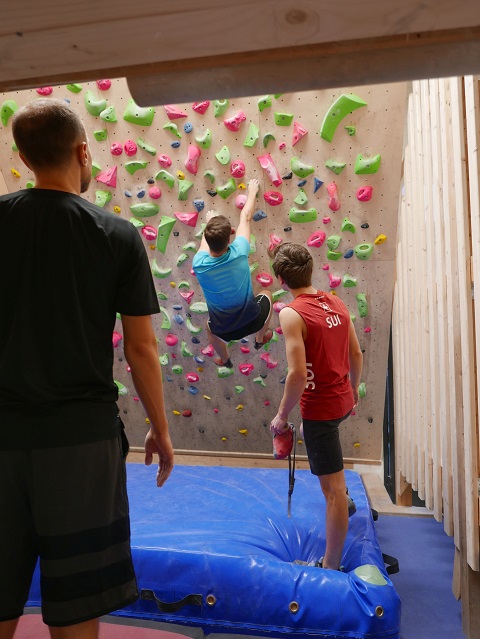 Das Techniktraining führten dann unsere Grossen. Dario bekam die nicht ganz einfache Aufgabe, an der ziemlich überhängenden Systemwand im «Käfig» möglichst machbare Boulder zu definieren, damit auch jedem einige Züge gelangen. Corsin führte in die Kunst des Plattenklettern`s ein, natürlich ohne Gebrauch der Hände. Bei Ilia wurde das Körpergewicht möglichst optimal verlagert, damit die Volumen gehalten und überwunden werden konnten. Nico definierte einen Boulder im Dach und bei Marilu wurden dann auch noch fleissig Dynamo`s geübt.